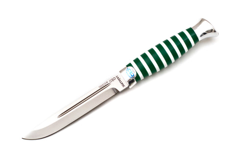 These series are pretty rare and are commemorative of military branches. BP, Border Patrol (green) is for Border Patrol. Knife has Border Patrol insignia embossed on the blade. Comfortable handle is made from hand fit plexiglass. Heavy to the hand, nice filling, seats great in the hand because of the ergonomic design. Duralumin bolsters.