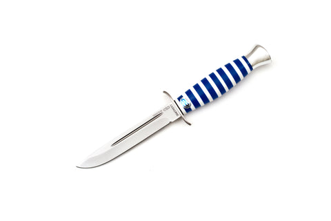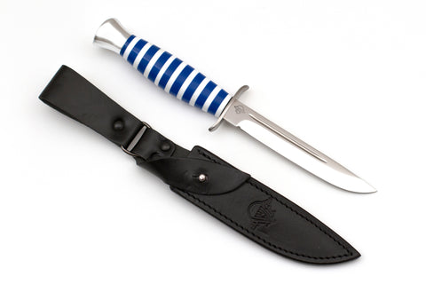 These series are pretty rare and are commemorative of military branches. VDV (blue) is for Airborne. Knife has Airborne insignia embossed on the blade. Comfortable handle is made from hand fit plexiglass. Heavy to the hand, nice filling, seats great in the hand because of the ergonomic design. Duralumin bolsters.